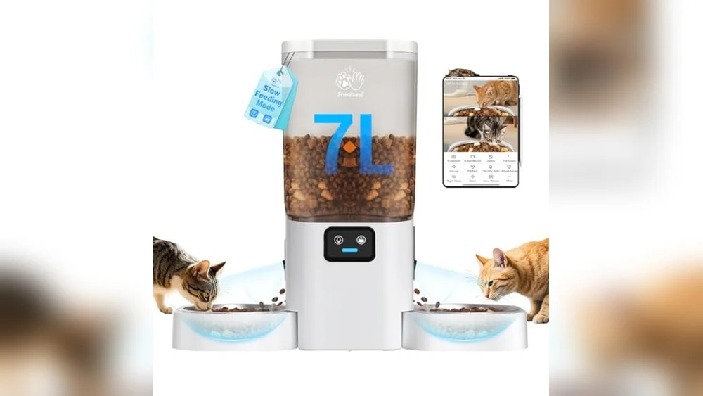 The Frienhund Automatic Cat Feeder stands out with its integrated dual HD cameras that provide clear visuals, even in low light thanks to night vision. This feature allows pet owners to monitor their furry friends remotely, ensuring their pets are safe and comfortable while waiting for their meals. The large 7L food capacity is designed to feed multiple cats or small dogs, reducing the frequency of refills and making it practical for multi-pet households.