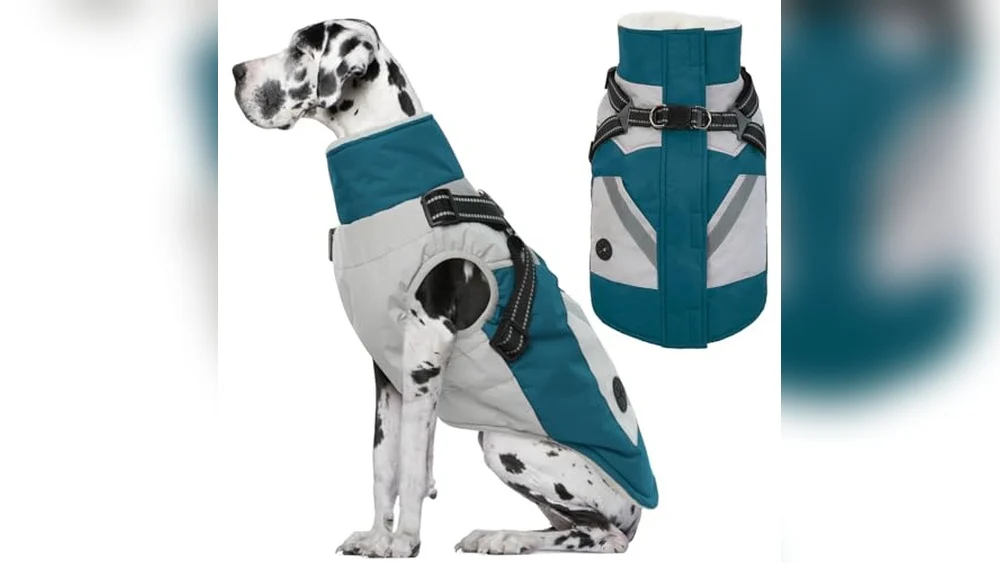 This IECOii Large Dog Coat keeps giant breeds warm and dry in cold weather. Reflective strips improve visibility during nighttime walks. The built-in harness makes leash attachment quick and easy. Soft fleece lining adds extra comfort and warmth. Its waterproof design protects dogs from rain and snow. Perfect for big dogs like Great Danes needing cozy winter wear.